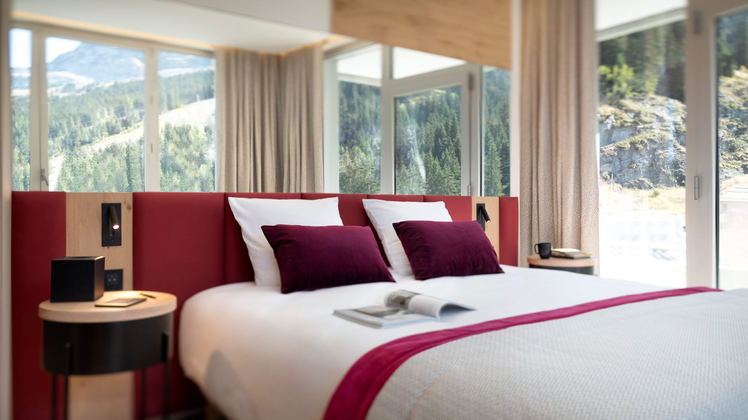 À l’extérieur, l’Hôtel Alhéna**** affiche un béton brut fidèle au style moderniste de Flaine ; à l’intérieur, des couleurs vives et des formes géométriques inspirées de Mondrian créent une ambiance chaleureuse et graphique.