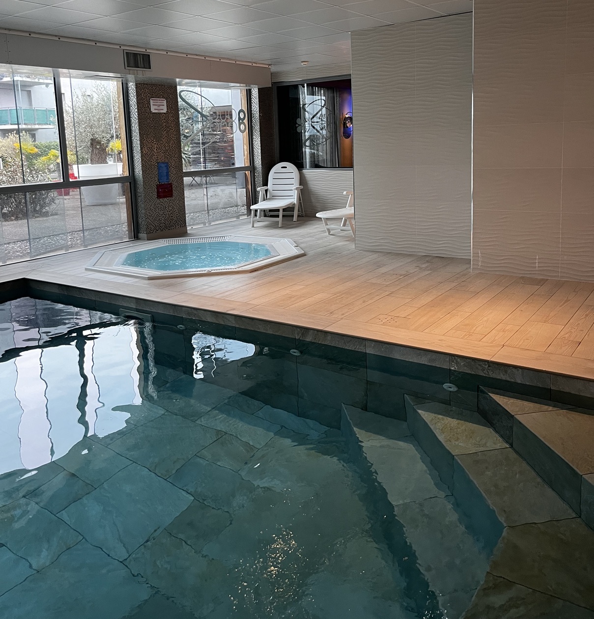 Il dispose d’un espace bien-être complet comprenant piscine intérieure, jacuzzi et salle de fitness, idéal pour se détendre après une journée de travail.